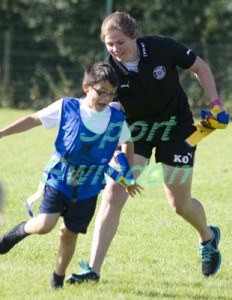 kim oliver_2207 LR England International Ladies Rugby payer Kim Oliver playing tag rugby at Shaw Ridge Primary School ← Lady rugby star at Shaw Ridge Primary School